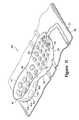 One suitable manufacturing process forsole component20 begins with the formation of the reinforcingelement40. Although a variety of techniques may be utilized, reinforcingelement40 may be die-cut from sheet stock, which enhances the efficiency ofmanufacturing footwear10 by eliminating the need for separate molds and molding operations. More particularly, asheet51 thatforms reinforcing element40 may be placed between opposing portions of a die-cuttingapparatus50, as depicted inFIG. 8A. Asapparatus50compresses sheet51, as depicted inFIG. 8B, edges on a cuttingsurface52 ofapparatus50 having the shape of reinforcingelement40 may extend though and cutsheet51. Following the opening ofapparatus50, as depicted inFIG. 8C, reinforcingelement40 may be removed. Additional milling may be required to add beveled edges or other modifications to the basic shape. Reinforcingelement40 may then be cleansed with a detergent or alcohol, for example, in order to remove surface impurities, such as dust or fingerprints. The surface of reinforcingelement40 may also be plasma treated to enhance bonding withbladder30.
