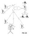 Preferably, monitoring data is wirelessly transmitted from LDUs at the monitored subjects to remote monitoring personnel at external monitoring facilities. InFIG. 2A,antennas37 onLDUs39 are in wireless contact with one or more receivers oraccess points13 and15, from which data is forwarded to externalmonitoring facilities systems19 over wired and/orwireless network11.Network11 can be a private or shared wired network, can be implemented through cellular phone systems, can use satellites, can use longer range wireless technologies, or the like. The access points can mutually interconnected in order to cooperatively relay data to network11 and on to the external monitoring facilities.External monitoring facilities19 store, process and format received data for display atmonitoring stations21,23, and25 linked to the facility. Here,station25 is at the external monitoring facility site, whilestations21 and23 are more remotely located and accessed overfurther networks17. Processing atexternal monitoring facility19 can be limited to duplicating, checking, or extending that already done at the LDUs, or can include use of automatic medical monitoring and diagnostic methods known in the art. All communications, especially wireless communications, are preferably encrypted to insure security and privacy.