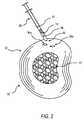 FIG. 2 is a cross-sectional view illustrating one embodiment of the implantable drug depot having an anchor attached to the drug depot by a line (e.g., suture, yarn, etc.) that is being administered into an intervertebral disc having an annulus.