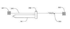 Referring now toFIGS. 94A-94C, one embodiment of the process of mating acannula5010, where the cannula is a traditional cannula requiring an introduction needle (as shown inFIG. 86B) to the base Y and establishes fluid communication with afluid line310 is shown.FIG. 94A shows a sectional view of acannula5010 with two septa: anintroduction needle septum5062 and afluid line septum5270. Theintroduction needle septum5062 seals apassageway5280 leading to the hollow needle (not shown, shown inFIG. 94B as5290) of thecannula5010. Acannula introduction needle5240 is shown positioned above theintroduction needle septum5062 and just prior to insertion of theintroduction needle5240.