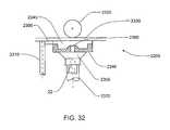FIG. 96 schematically shows a sectional view of afluid delivery device10, with an insertedcannula5010, held securely under anadhesive patch3100. Apad3220 may be included between thedevice10 and a patient'sskin3250 and allow air to flow to the skin. Air flow to skin may be increased by the inclusion ofpassageways3230 in thepad3220.Passageways3230 may also be formed by using multiple pads that are spaced apart or by constructingpad3220 from a highly porous material. Thus, thepad3220 can be any shape and size and in some embodiments, thepad3220 is made up of a number of separate pieces.Pads3220 may be either adhered to the underside of thedevice10 during manufacture or may be adhered to thedevice10 by a user. Alternately, thepad3220 may be loosely placed onto the skin by a user prior to application of theadhesive patch3100. Thepad3220 may include a compliant material, such as porous polymeric foam.