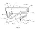 Referring now toFIGS. 92G-92H, an inserting cartridge bolt locking mechanism for use with an inserter, such as the one shown inFIGS. 91A-92F, as5100 is shown. The cartridge bolt locking mechanism can function as an interlock to prevent accidental firing while the mechanism is being cocked. The locking mechanism includes acatch5420, which when engaged in acatch recess5410, prevents downward movement of thecartridge bolt5380. As shown inFIG. 92G, when the cockinglever5145 is in a closed position, the cockinglever5145 contacts acatch lever5440, which rotates thecatch5420 and prevents thecatch5420 from inserting into thecatch recess5410. Acatch spring5430, disposed between thecatch5420 and acatch spring support5450, is in a compressed positioned. Thecartridge bolt5380 and triggerhammer5340 are free to move. As shown inFIG. 92H, when the cockinglever5145 is rotated into a downward position, thecatch lever5440 is released, thereby allowing thecatch spring5430 to force thecatch5420 to insert into the recess (here thecatch5420 is shown inside the recess, but the recess is shown inFIG. 92G as5410); downward movement of thecartridge bolt5380 is thereby prevented. Return of the cockinglever5145 then returns thecatch5420 to an unlocked position. Thecartridge bolt5380 is then free for downward movement in the triggering process.