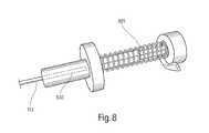 As noted above in reference toFIG. 1A, theextraction system100 may include thecontrol member115 and theactuator119 for actuating thecutting mechanism108. Thecontrol member115 may be a wire, a rod or any other device capable of translating thecutting mechanism108. Such acontrol member115 may be passed through acutting mechanism lumen603 as shown inFIG. 6A, inside theelongated member102, and may be attached to thecutting mechanism108 for actuating thecutting mechanism108 between the first retracted position, as shown inFIG. 6B, and the second advanced position, as shown inFIG. 6C. In another embodiment, illustrated inFIGS. 7A-7B, thecontrol member115 may extend along anouter surface707 of theelongated member102. In such embodiments, to stabilize thecontrol member115 in the longitudinal direction, one ormore channels709,711 may be provided along theouter surface707 of theelongated member102 for passing thecontrol member115 therethrough. Thecontrol member115 may be attached to thecutting mechanism108 to actuate thecutting mechanism108 between the first retracted position, as shown inFIG. 7A, and the second advanced position, as shown inFIG. 7B. In an embodiment, thecontrol member115 may be actuated using, for example, a spring loadedplunger801, as shown inFIG. 8, attached to adistal section803 of thecontrol member115.