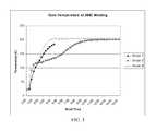 Each molded sample was evaluated for the degree of cure by testing evenness of the surfaces, water hold-up, and extract. A sample was deemed to be cured when the surfaces are smooth without any “bumps”, the sample does not noticeably weaken when immersed in water, and no significant extract color is formed when immersing the sample in water. The temperature profile of the center of the sample is measured during the molding cycle and is shown inFIG. 3.