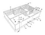 Referring toFIGS. 31-33, the elevation of the top414 ofbase400, is defined by the top ofslab38 and the top of themain footer components55. The elevation of the top414 of the base is shown in dashed outline inFIG. 33 becauseFIG. 33 shows a precursor assembly before ready-mix concrete, which may be known by such names as “Quik Crete”, has been poured in fabricating the main footer body. The top of the base is above the elevation of thetops416 ofmini footers402 such that thebottoms412 ofpanels14 andwall10 extend below the top414 ofbase400, and are thus embedded well below the top ofbase400, for example at least 1 inch, and up to about 8 inches, below the top ofbase400.