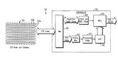 Returning toFIG. 6, the amplified signal from theamplifier502 is passed to the automatic gain control (AGC)504. Using feedback from theMPU420, theAGC504 automatically scales the output of theamplifier502. TheAGC504 is adjusted so that the dynamic range of the signal eventually fed into theADC416 closely matches its full scale reference. This can reduce digitization noise that could otherwise result when weaker signals are received by the array ofelectrodes154.