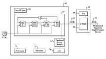 Distinguishing an LFSR from an ordinary shift register, not all possible states are necessarily available to the LFSR. Since the input of the LFSR is determined by the placement of the taps and the combinatorial logic applied, it is possible that an LFSR is unable to achieve some particular states. For example, if theLFSR58 ofFIG. 4 included a simple AND gate instead and XOR gate, and if theLFSR58 was initialized with a seed value of “1111,” then the state output from such an LFSR would perpetually remain at 1111. Accordingly, it is understood that the sequence of bits shifted to the output of an LFSR can be fully characterized by specifying the number of bits in the LFSR, the number and location of the taps, the combinatorial logic, and the initial (i.e., seed) state of the LFSR.