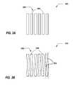 FIG. 3A depicts an exemplary top-view300 ofstructures308 in a tensile to aneutral stress layer304 after using the techniques of reducing line roughness in an embodiment of the present invention.FIG. 3B is an exemplarytop view350 in acompressive stress layer354 on asubstrate362. Due to the compressive stress on thefilm354, thestructures358 are “wiggly” instead of being straight as in an ideal or close to ideal line-and-space pattern. Using the techniques of the present invention of flexing by causing a degree of concavity on thesubstrate362 during or after the deposition or curing of thesubstrate362, and unflexing thesubstrate362 to induce a target tensile stress on the substrate, the line roughness can be reduced. The line roughness can be reduced by up to 2 nm of 3σ of the deviation. Unflexing thesubstrate362 comprises removal of the cause of concavity on the substrate, reduction in the concavity of the substrate, change to a lower temperature, or change of a variable, for example, from a high vacuum state during the flexing to a lower vacuum state after the flexing is complete. Removal of the cause of concavity on the substrate can include lowering the power used in an electrostatic chuck or as mentioned above, lowering the vacuum state of a vacuum chuck. Other factors such as changes to the density of film or changes of the film material may also cause a change in tensile stress on the film on the substrate.