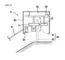 Similarly to the movermain driving wheels51 and the moverpassive wheels53, ahorizontal roller59 is provided in each of the front and the rear of the straddle-type mover body4. Thehorizontal rollers59 are supported rotatably to theframe65, and are configured to roll the top of thebeam91, thereby serving to maintain the position of the straddle-type mover body4 in the vertical direction. The surfaces of thehorizontal rollers59 are covered with an elastic material, such as a hard rubber.