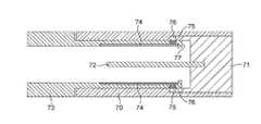 Internal heater element74 is formed on an interior surface of thesleeve73 and extends around the circumference of the sleeve. The internal heater elements are electrically resistive tracks formed on the extractor sleeve and may be made from platinum. In order to provide electrical power to theexternal heater element74electrical contacts75 are provided that provide an electrical connection between the resistive tracks on the interior surface of thesleeve73 and a contact area on an external surface of thesleeve73. Thecontacts75contact housing contacts76 when thesleeve73 is in a fully inserted position.Housing contacts76 are electrically connected to a controller and a battery within the aerosol generating device, as described with reference toFIG. 1.