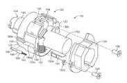 In the illustrated embodiment, thelock chassis110 includes anadjustment plate136 that includes anannular portion154 and aflange156. Theadjustment plate136 may threadingly engage thelock chassis110 such that rotation of theadjustment plate136 may displace the axial position of theadjustment plate136 at least relative to thelock chassis110. For example, according to the illustrated embodiment, at least theannular portion154 and/or theflange156 of theadjustment plate136 may have an internal thread that mates an external thread on theouter wall132 of thehub portion128 of theoutside housing122.