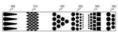 FIG. 3 illustrates one or more material layer patterns for depositing onto a deformable electronic such as described above. The material layer is able to be patterned onto a deformable electronic such as a flexible circuit board and designed to modify stress concentrations away from weak points in the assembly or spread out the stress to increase the radius of the curvature, and therefore decrease the chance of mechanical failure. As described above, the material layer is able to be patterned into a combination of interlockingcones305,rhomboids315,circles325,circles335,squares345, orhexagons355. Particularly, the material layer is patterned in order to obtain the desired mechanical stiffness and increase strength in one or more of the X dimension, the Y dimension, the Z dimension, and other dimension of the deformable electronic. As described above, the material layer is able to be deposited on the inner layers and/or outerlayers of the deformable electronic300.