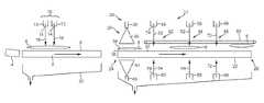 The air knives10,12 are parallel and longitudinally separated by a distance of, for example, a distance of from 100 to 300 mm, typically about 150 mm, so that eachpotato slice6 is sequentially impacted byplural air blades16 during the passage of thepotato slice6 through the primary air-blower station18. Alternatively, the air knives10,12 may be separated by a distance which is less than a typical dimension of a potato chip, for example a distance of less than 50 mm, such as 30 to 40 mm, so that eachpotato slice6 is simultaneously impacted byplural air blades16 during at least a portion of the passage of thepotato slice6 through the primary air-blower station18. Optionally, the air knives10,12 are inclined rearwardly so that the displaced oil is directed rearwardly into theoil capture device20, which enhances oil capture.