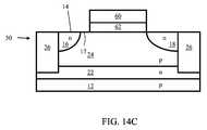 Fin structure52 also includessense region20 of a first conductivity type (such as p-type conductivity type).Sense region20 may be formed by an implantation process formed on the material making upsubstrate12, according to any implantation process known and typically used in the art. Alternatively, a solid state diffusion process could be used to formsense region20. Thesense region20 is now electrically connected to the floating body region.