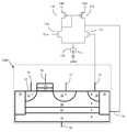 Asense line region20 having a first conductivity type, such as p-type, for example, is also provided in floatingbody region24 and is exposed atsurface14.Sense line region20 may be formed by an implantation process performed on the material making upsubstrate12, according to any implantation process known and typically used in the art. Alternatively, a solid state diffusion process can be used to formsense line region20. Thesense line region20 has the some conductivity type as the floatingbody region24, with thesense line region20 typically being more heavily doped than the floatingbody region24.
