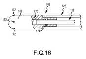 With continued reference toFIG. 16, it should be understood thatcatheter100, for example, the relatively flexible distal segment146 (best shown inFIG. 5) ofshaft122, may be further configured to carry various electrodes, sensors and transducers configured to transfer, receive or sense energy to and from an environment external or internal thereto.