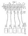Vial14 further includes a luer-activatedvalve96 and a pressure-activatedvalve98 serially connected tofirst end70 ofconduit68. First end70 ofconduit68 is sealingly affixed to luer-activatedvalve96 at one end and pressure-activatedvalve98 is removably attached to luer-activatedvalve96 at the opposed end. Pressure-activatedvalve98 is removably attached to a connector means36a-eofmanifold12. Luer-activatedvalve96 is put in an open position when pressure-activatedvalve98 is attached to it, and a closed position when pressure-activatedvalve98 is disconnected from it. Pressure-activated valve is biased to a normally-closed position, opening under fluid pressure frommanifold12. Thus, when a controller causes a pump to stop directing fluid intovial14, pressure-activatedvalve98 will move to a closed position, sealingcavity44. Thus, pressure-activatedvalve98 may be disconnected from its attached connector means ofmanifold body12 while still protecting the contents ofvial14 from exposure to the environment outside thereof. Additionally, when pressure-activatedvalve98 is disconnected from luer-activatedvalve96, luer-activatedvalve96 will be in a closed configuration which continues to protect the contents ofvial14 from exposure to contaminants. A needle-less syringe may then be connected to luer-activated valve to again open the valve and allow the contents incavity44 to be removed therefrom and into the attached syringe. Alternatively, a syringe supporting a needle may be connected to luer activatedvalve96 so as that the needle punctures an elastomeric stopper of luer-activatedvalve96, also allowing the contents ofvial14 to be withdrawn without exposing the same to contamination.