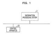 DESCRIPTION OF EMBODIMENTSEmbodiments disclosed herein will be described below with reference to the accompanying drawings.FIG. 1 is a block diagram illustrating an exemplary system configuration in the embodiments disclosed herein. InFIG. 1, aninformation processing system2 and acontrol apparatus10 can communicate with each other through a network, such as a local area network (LAN) or an internal connection.