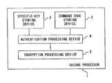 FIG. 1 is a block diagram showing the principle configuration of the present invention's secure processor. In this figure, thesecure processor1 of the present invention comprises a specifickey storing device2, an instructioncode storing device3, anauthentication processing device4 and anencryption processing device5.