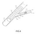 FIG. 8 is a perspective view of an exemplary embodiment of a prosthetic conduit, shown within a cross-section of a vessel with a side-branch, with the main member fully expanded and the side-branch member not fully expanded.