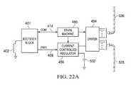 Referring now toFIG. 22A, there is illustrated a five block diagram of the IPG. As noted hereinabove, there is providedoverall state machine460 to control the operation of the system to control drivers to provide a constant current level to electrodes on any one ofmultiple leads535 or536. Thedriver454 is provided current through a current controlledregulator459. The power level is adjusted via communication with the headset to adjust the power transferred to thecoil402 vary the voltage out of therectifier block401. This current controlledregulator459 is controlled to both charge and maintain charge on thesupercapacitor532 and also provide current to thedriver454. Once thesupercapacitor532 is charged, and the current required by thedriver454 is more than can be provided by thesupercapacitor532, thedriver454 receives all of the power from the headset across thecoil402. As long as the voltage level on thenode408 is at a sufficient level to maintain current regulation in theregulator459, current can be provided at the appropriate regulated level. However, if the voltage level increases atnode408, heat will be dissipated in theregulator459 unnecessarily. Therefore, communication is maintained with the headset to minimize the amount of power transferred to lower the voltage onnode408 to a point that is high enough to maintain current regulation but no higher. Thus, when the voltage required to drive the coil on the headset side is lowered, theregulator459 falls out of regulation, at which time, the request will be sent back to the headset to increase the power in order to just maintain the necessary voltage onnode408 to maintain current regulation for a particular neurostimulation program being run.