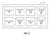 FIG. 2 is a diagram of one embodiment of asocial networking system130. The embodiment of asocial networking website130 shown byFIG. 2 includes aweb server210, anaction logger215, anAPI request server220, anaction log230, auser profile store240, aconnection store245 and atemplate store250. In other embodiments, thesocial networking website130 may include additional, fewer, or different modules for various applications. Conventional components such as network interfaces, security mechanisms, load balancers, failover servers, management and network operations consoles, and the like are not shown so as to not obscure the details of the system.