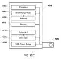 FIG. 42C illustrates an embodimentproximity broadcast receiver4275 that can be plugged into a power outlet. Similar to the embodiment described above with reference toFIG. 40A, theproximity broadcast receiver4275 may include aprocessor4002, amemory unit4012, and a short-range radio4004 (e.g., Bluetooth®, Bluetooth LE, LTE-D, peer-to-peer LTE-D, Zigbee®, Peanut®, etc.) connected to anantenna4006. Theproximity broadcast receiver4275 may also include a WiFi system-on-chip4278 (referred to as “SOC” inFIG. 42C) coupled to asecond antenna4276. In another embodiment, the system-on-chip4278 may be a Bluetooth Low Energy system-on-chip. Theproximity broadcast receiver4275 may utilize the system-on-chip4278 to exchange data over a wireless local area network, such as by communicating with a WiFi router. Additionally, theproximity broadcast receiver4275 may include aplug4282 for interfacing with a power supply or otherwise receiving power, such as alternating current power (or “AC”). In various embodiments, theplug4282 may be configured to connect with different power outlets standards (e.g., British Standards, National Electrical Manufacturers Association, etc.), and may include a grounding element (not shown). Theplug4282 may be coupled to aUSB Power supply4280 that provides power to the various components of theproximity broadcast receiver4275, such as theprocessor4002. In an alternative embodiment, theproximity broadcast receiver4275 may recharge an internal battery (not shown) using power received from theplug4282 and/orUSB power supply4280.
