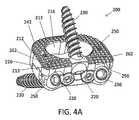 According to a fourth embodiment,FIGS. 4A-4E show animplant200, which may be particularly suitable for an anterior lumbar procedure. In general, most of the structure ofimplant200 is similar or comparable to the structure ofimplant1. In this particular embodiment, threedifferent inserts250 provide thefastener apertures234.