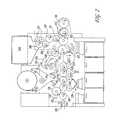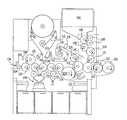 The frame of the filter tipping machine further supports an expiringreel114 for a supply of an elongated web orstrip113 which is convoluted onto the core of thereel114. Theweb113 is advanced lengthwise by rollers116 which cause it to advance over the pronounced edge of a conventional curling tool117, and a rotary drum-shapedsuction conveyor119 thereupon causes theweb113 to advance into and beyond apaster118 serving to coat one side of the web with a film of a suitable adhesive. The adhesive-coated leader of theweb113 is severed at requisite intervals at the periphery of thesuction conveyor119 to yield a succession of adhesive coated discrete portions or uniting bands which are attached to successive groups of rod-shaped articles in the flutes of thetransfer conveyor112. Each uniting band extends along and slightly beyond both axial ends of the respective filter rod section of double unit length.
