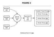 If threads were removed in the previous action, the job moves to step616. Atstep616, if T.delta indicates an increase in throughput, the job removes one or more further threads from the thread pool and reduces the period of time before the next analysis. Atstep616, if T.delta indicates a decrease in throughput, the job adds back one or more threads to the thread pool and increases the period of time before the next analysis. A decrease in throughput in response to removing threads can be indicative that too many threads have been removed, e.g. in response to diminishing workload, “undershooting” the optimal number of threads. Thus, one or more threads are added back and analysis is decelerated to dampen oscillations. After adding threads or removing threads the job moves to step620.