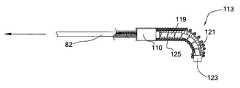 In assembly,marker band115 is inserted mid-way into the distal end ofouter catheter body117 and bonded to form a lip.Inner catheter82 has a distal spiral cuttube119 at its distal end and is inserted throughouter catheter117 andmarker band115 until it extends a distance past the distal end ofouter catheter117 andmarker band115. The proximal end ofcolumn121 is attached either to the surface ofmarker band115 or inserted into the distal end ofouter catheter117 between themarker band115 and the inner lumen of theouter catheter117 and then attached. The distal end ofcolumn121 is attached to the distal end of spiral cuttube119 ofinner catheter82 usingmarker band123.