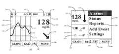 In certain embodiments, various screen types are output on thedisplay210 of theanalyte monitoring device200. Each screen type provides different functionality, prompts and information to a user. Examples include menu screen types and informational screen types. In certain embodiments, informational screen types include a plurality of display screens organized into a hierarchy of display screens. The display screens of the informational screen types typically, but not necessarily, show graphs, connection status, alerts, warnings, and the like. In certain embodiments, when informational screen type alerts, warnings or prompts are displayed, a processor of theanalyte monitoring device200 causes an alarm to be output if the alert is not acknowledged within a predetermined amount of time (e.g. 1 hour). In certain embodiments, menu screen types include menus having selectable menu items. Because the display screens are hierarchically arranged, upon selection of a menu item, the display screens linearly progress to various functions represented by the menu item (e.g., by actuation of a softkey button corresponding to a “Next” softkey label), additional display screens or further submenus. Although specific screen types have been mentioned and will be described in further detail below, it is contemplated that various other screen types may be included in the user interface ofanalyte monitoring device200.