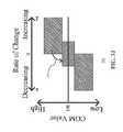 In certain embodiments, the alarm tone for the dynamic glucose level alarm may be a unique alarm such that the user is more readily warned of the possible pending condition. As such, in one embodiment, this particular alarm may be preset and the user may not have the option to select a new alarm tone. In another embodiment, the alarm tone may be user selectable but only from a tone library that is separate and unique and a tone library that may be used by other alarms of theanalyte monitoring device200. Additionally, the display of theanalyte monitoring device200 may display a rate of change arrow that successively flashes on and off to give the user a visual indication that the user's glucose levels have been rising or falling at a rate greater than the threshold rate of change for over the predetermined time period.