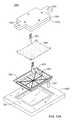 Hollow spacers213 may be placed belowdimples206 intop metal shell204, and rivets214 provided, extending through openings indimples206, throughhollow spacers213 and through openings in printedcircuit board210 tobase metal shell202 in order to fixedly secureelectronic assembly208 within the enclosure formed by base andtop metal shells202,204. A security mesh or tamper-respondent sensor216 is wrapped around the top, base, and four sides of the enclosure formed by base andtop metal shells202,204. As illustrated, in one or more embodiments,top metal shell204 may have an opening through which abus220 extends. One end ofbus220 may be connected to conductors (not shown) on printedcircuit board210, and the other end may be connected to conductors (not shown) on a printedcircuit board222. Asbus220 passes through the opening, the bus extends between aninner edge region223 of thesecurity mesh216 and an overlapping,outer edge region224 of thesecurity mesh216. A group ofwires226 connect, in one embodiment,security mesh216 to conductors on printedcircuit board210. Circuitry on printedcircuit board210 is responsive to a break or discontinuity insecurity sensor array216, in which case, an alarm signal may be emitted onbus220, and also encryption/decryption keys stored withinelectronic assembly208 may be erased.