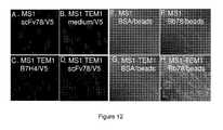 Example 4Identification of Anti-TEM1 ScfvTEM1 or endosialin was first described as a marker of tumor endothelial cells. Other studies showed that endosialin is highly expressed on pericytes and stroma cells related to tumor angiogenesis, proliferation, migration and metastasis. Recently, endosialin was described as both a tumor endothelial and an endothelial precursor cell marker with high expression in tumors and little or no expression in normal tissues. Therefore, targeting TEM1 with antibody or antibody-conjugated reagents such as an immunotoxin, isotope, or nanoparticles is a promising approach for both diagnosis and therapy. The TTP yeast-display library was enriched for scFv that bind to recombinant human TEM1-GST protein (rhTEM1-GST) first by magnetic and then by flow sortings and was depleted by magnetic sortings from scFv binding to control recombinant GST (rGST) protein, as previously described. Magnetic sorting is based on one parameter of selection only (capture of antigen-binding yeast), thereby providing a rapid means for robust enrichment of antigen-specific scFv. Flow sorting uses two parameters of selection, including antigen binding and recognition of c-myc tag on scFv displayed at the yeast cell surface, thereby further enriching for antigen-specific scFv while preventing the selection of yeast that bind to antigen directly through their coat. DNA was extracted from double-positive sorted yeast to amplify scFv sequences with primers allowing homologous recombination with p416 BCCP vector. Resulting transformants secreted scFv enriched for TEM1-specific binding.