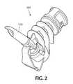 FIG. 2 illustrates one embodiment of the coupling device of the present invention, i.e. aninfusion spike101, which is provided with a needle-formed piercingmember110 which may be introducible in a part which constitutes an inlet/outlet of a medical device such as an infusion bag (not illustrated). This inlet/outlet part of the infusion bag may be designed as a flexible tube with a circular cross-section corresponding to the cross-section of the piercingmember110 of thecoupling device100 and may have, before the introduction of the piercingmember110, a membrane, e.g. a sealing membrane, arranged at a mouth. The injection spike is provided with two fluid channels for fluid connection between a piercing tip portion and a connection site for a hose or the like and a site for connection to, for example, a fluid injector such as a syringe. The arrangement will be described in more detail below. During the introduction of thespike101, the piercingmember110 penetrates the membrane and the infusion bag be opened towards channels in thespike101. A fluid port is thus provided on the infusion bag.