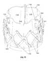Thegraft enclosures7120 also supplement the outward external force imposed by the actively expandedstent lattice7110 as explained below. A first characteristic of thegraft enclosures7120, however, is to secure thegraft material7130 to the replacementheart valve assembly7100. Thegraft material7130 needs to be very secure with respect to thestent lattice7110. If thegraft material7130 was attached, for example, directly to theouter struts7112 of thestent lattice7110, the scissoring action that theadjacent struts7112 perform as thestent lattice7110 is expanded and contracted could adversely affect the security of thegraft material7130 thereto—this is especially true if thegraft material730 was sewn to theouter struts7112 and the thread passed therethrough to the inside surface of theouter strut7112, against which the outer surface of theinner strut7112 scissors in use. Accordingly, thegraft enclosures7120 are provided at a plurality of theouter struts7112 of thestent lattice7110 as shown inFIGS. 71 to 87. Eachgraft enclosure7120 is fixedly attached at one end of its ends to a corresponding end of anouter strut7112. Then, the opposing, free end of thegraft enclosure7120 is woven through the inner side of thegraft material7130 and then back from the outer side of thegraft material7130 to the inner side thereof as shown inFIGS. 71 to 75, for example. The opposing, free end of thegraft enclosure7120 is fixedly attached to the other end of theouter strut7112. This weaving reliably secures the outer circumferential side of thegraft material7130 to thestent lattice7110.