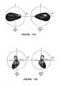FIGS. 21A-21F illustrate radiation patterns for the hybrid antenna, according to some embodiments of the present inventive concept. Specifically, one of the two patterns illustrated in each of theFIGS. 21A-21F corresponds to the c-fedantenna element501 of the hybrid antenna, and the other one of the two patterns corresponds to themonopole antenna element503mof the hybrid antenna. As the radiation patterns for the c-fedantenna element501 and themonopole antenna element503mare substantially opposite/mirror images from each other in both the low band (FIGS. 21A-21C) and the high band (FIGS. 21D-21F), this indicates that the radiation patterns have been separated effectively. Accordingly, the radiation patterns ofFIGS. 21A-21F are a further indication that the hybrid antenna using the c-fedantenna element501 and themonopole antenna element503mprovides good MIMO performance.
