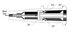 FIG. 4A-4C illustrate a cross-sectional side view of the catheter adapter shown inFIGS. 3A-3C.FIG. 4A illustratesrecess310 that can be formed incatheter adapter300.Arms201 extend intorecess310 prior to activation of the valve thereby preventingactuator200 from falling out ofcatheter adapter300.FIG. 4A also shows that, prior to activation, blood can flow intocatheter adapter300 up toseptum301 which blocks the blood flow from passing out through the other end ofcatheter adapter300. In this way, aftercatheter302 is inserted into a patient's vasculature, the clinician need not worry about blood flowing out throughcatheter adapter300 before another device is attached to open the blood control catheter valve.