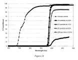 FIG. 14 shows percent transmittance spectra for appliances according to an embodiment of the invention formed by soaking the appliance in 28.1% DP containing nanoparticles solutions in various concentrations of ethanol relative to a control appliance free of nanoparticles.