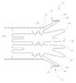 FIG. 5E shows a variation with struts that taper from wider at a lateral edge of a tack to narrower at a mid-section of the strut and/or from narrow at a mid-section of a strut to wider adjacent to a medial location of the tack.