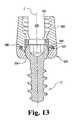 In another embodiment (FIG. 12), opening558 is non-perpendicular to axis L of aperture536 ofreceiver member530. In this case, there will be afirst part574 of opening558 that is relatively close toreceiver member530 and a diametrically opposedsecond part576 of opening558 that is relatively distant fromreceiver member530. Whenfastener31 is oriented so thatshank portion52 is substantially adjacent tofirst part574 ofopening558, then the maximum angle offastener31 with respect to axis L is greater than a maximum angle afforded by another part ofopening558.