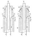 FIG. 8B depicts thesleeve800 in a condition in which the pressure is above a threshold. The threshold is provided by a physical configuration of therelief valve802 and804. Below the threshold, thevalves802 and804 are compressed or pinched closed. Thevalves802 and804 may be provided by slits in the tapered section or the straight section of thesleeve800. Due to the flexible, elastic properties of the material from which thesleeve800 is fabricated, thevalves802 and804 remain closed until the threshold is exceeded, in which case thevalves802 and804 provide additional outlets for the irrigation fluid, reconfiguring the fluid paths A1 and A2 ofFIG. 8A into the fluid paths B1 and B2 ofFIG. 8B. By providing therelief valves802 and804, a temporary increase in pressure may not increase forward flow out of the distal end of thesleeve800. Rather, the additional outlets through which irrigation fluid flows in fluid paths B1 and B2 may direct fluid away from the distal end ofsleeve800.