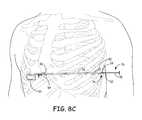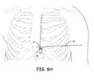 Lead16 is removed from the inner channel ofsheath50 andsheath50 is removed from the body ofpatient12 while leavingdefibrillation lead16 in place (as illustrated inFIG. 8I).Sheath50 may be peeled offlead16 via opening62 as described with respect tosheath60 ofFIG. 3, split and peeled off along ascore line83 or other weak portion of the sheath as described with respect tosheath80 ofFIG. 5, or slit using a slitter and peeled off as described with respect tosheath86 ofFIG. 6. In some instances, the distal end oflead16 may include an anchoring mechanism to fixate the distal end oflead16 in place near the superior location (e.g., near the second or third rib). The anchoring mechanism may include tines, a helix, or other anchoring mechanisms. In other examples, a third incision may be made toward the top ofsternum28 proximate the desired location of the distal end ofdefibrillation lead16. In this case,rod30 may be advanced subcutaneously fromsecond incision92 to the third incision untildistal end38 exits through the third incision. The distal end ofdefibrillation lead16 would also be advanced throughsheath50 until it is adjacent to the third incision. The distal end ofdefibrillation lead16 may then be affixed to the desired location proximate the third incision via a fixation mechanism separate fromdefibrillation lead16, e.g., sutures, staples, anchor sleeve, or the like, or built intodefibrillation lead16, e.g., tines, helix or other built in fixation mechanism.