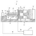 In the embodiment ofFIG. 1, thesensor52 is a pressure sensor that measures (directly or indirectly) melt pressure of the moltenthermoplastic material24 in thenozzle26. Thesensor52 generates an electrical signal that is transmitted to thecontroller50. Thecontroller50 then commands thescrew control36 to advance thescrew22 at a rate that maintains a substantially constant melt pressure of the moltenthermoplastic material24 in thenozzle26. While thesensor52 may directly measure the melt pressure, thesensor52 may measure other characteristics of the moltenthermoplastic material24, such as temperature, viscosity, flow rate, etc, that are indicative of melt pressure. Likewise, thesensor52 need not be located directly in thenozzle26, but rather thesensor52 may be located at any location within theinjection system12 ormold28 that is fluidly connected with thenozzle26. If thesensor52 is not located within thenozzle26, appropriate correction factors may be applied to the measured characteristic to calculate the melt pressure in thenozzle26. In yet other embodiments, thesensor52 need not be fluidly connected with the nozzle. Rather, the sensor could measure clamping force generated by theclamping system14 at a mold parting line between the first andsecond mold parts25,27.