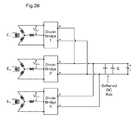 FIG. 14 is a schematic circuit diagram of a circuit for conditioning three phase power being applied to (released via) a generator/motor during storing (retrieving) of energy;