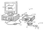 When coupled together, theconnector16 and thereceptacle26 may facilitate the exchange of information between themonitor12 and the sensor14. More particularly, sensor14 may provide electrical signals representative of various data, such as physiological data, to themonitor12 via theconnector16. In some embodiments, the sensor14 may process the signals and may provide physiological information or parameters to themonitor12 via theconnector16. Additionally, themonitor12 may provide instructions and/or operational parameters to the sensor14 via theconnector16. For example, themonitor12 may provide light drive signals to illuminate theemitters20 of the sensor14 via theconnector16. Themonitor12 may include amonitor display28 configured to display information regarding the physiological parameters, information about the system, and/or alarm indications, for example. Themonitor12 may also includevarious input components30, such as knobs, switches, keys and keypads, buttons, etc., to provide for operation and configuration of themonitor12 andmonitoring system10. As noted above, themonitor12 may be configured to receive electrical signals from the sensor14 via theconnector16, and themonitor12 may be configured to process the received signals to calculate various physiological parameters, such as oxygen saturation, for example.