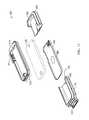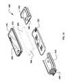 Bottom shell220 similarly has a top edge228,bottom edge229 andsides227 forming its perimeter. Around the perimeter, it featuresinner wall221 andouter wall222, the latter of which has cutouts at certain intervals to accommodate the overmolds and covers (e.g.,211 and218) of thetop shell210. Theinner wall221 andouter wall222 cooperate to form a trench that extends along the inner perimeter of thebottom shell220 and accommodates the joiningseal253. Though shown as being fixed to the distal end of thedownward extension209 of theupper shell210, it will be understood that the joiningseal253 could alternatively be molded into the trench, such that it remains with thebottom shell220 when thetop shell210 is pulled away.