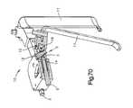 Central blade angulation is also controlled by aratchet mechanism70 which involves the release of the ratchet mechanism. The proxima lend51 of theblade holder66 has a toothedcylindrical edge46. Asingle tooth47 protrudes from thedistal end53 of thecentral arm55. Theratchet mechanism70 includes the toothedcylindrical edge46 of theblade holder66 andsingle tooth47 of thecentral arm55. Thecentral arm55 is biased distally by any suitable biasing member, such as a spring, so that thetooth47 engages the toothedcylindrical edge46 as shown inFIG. 80. Thecentral arm55 can be moved proximally against the influence of the biasing member to disengage the protrudingtooth47 When thetooth47 is disengaged from the toothedcylindrical edge46, the blade holder66 (along with the blade69) can be manually rotated about at a fixedaxis71. Thecentral arm55 can be released to allow the biasing member to urge thetooth47 distally, causing thetooth47 to engage the toothedcylindrical edge46. When thetooth47 engages the toothedcylindrical edge46, the ratchet mechanism locks the blade holder66 (and the blade69) in the prescribed position. The embodiment described above might thus provide for radiolucency at distal end to allow for better visualization under fluoroscopy; option for controlled bilateral retraction of the lateral blades; accommodation of various types of blades (cervical, thoracic or lumbar) as well as various lengths of blades for different approaches; angulation of all blades inward and outward, etc.