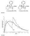 The mechanism of action of methylphenidate in ADD/ADHD is not fully understood, however the primary effects appear to be mediated through the blockage of the presynaptic dopamine transporter. Methylphenidate also exerts a relatively minor effect on norepinephrine reuptake that also contributes to activity. Volkow, et al. (1998)Am J Psychiatry155:1325-1331; Volkow et al. (1999)Life Sci65:PL7-12; and Volkow et al. (2002)Synapse43:181-187. Unlike amphetamine, methylphenidate blockade of the dopamine receptor is not thought to induce transporter conformation change resulting in the release of dopamine into the synaptic cleft as the receptor returns to its former conformation. Markowitz, et al. (2003)Pharmacotherapy23:1281-1299. With the exception of Focalin, of the four possible methylphenidate isomers, a mixture of the d,l-threo enantiomers is used in all current immediate and controlled release formulations; the erythro-isomer pair being much less active. Srinivas et al. (1992)Clin Pharmacol Ther52:561-568. The d-threo isomer is the most active of the two threo isomers (a 2:1 potency compared to the d,l-threo-mixture) and is the sole active constituent in the Focalin brand methylphenidate product. The chemical structure of the d- and l-threo isomers of methylphenidate is shown inFIG. 1.